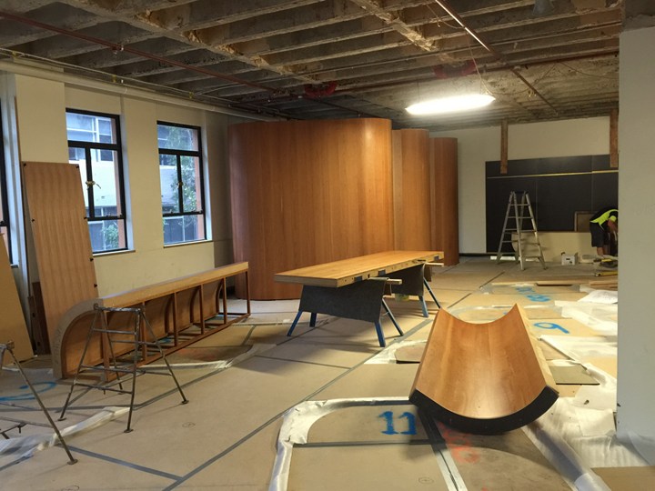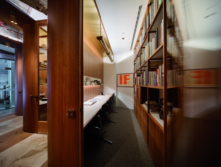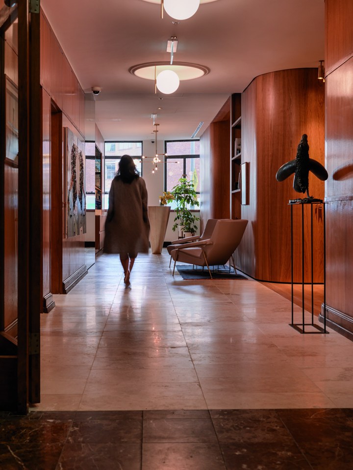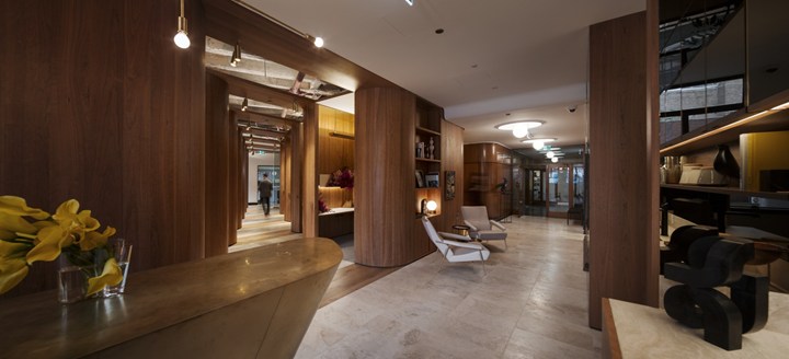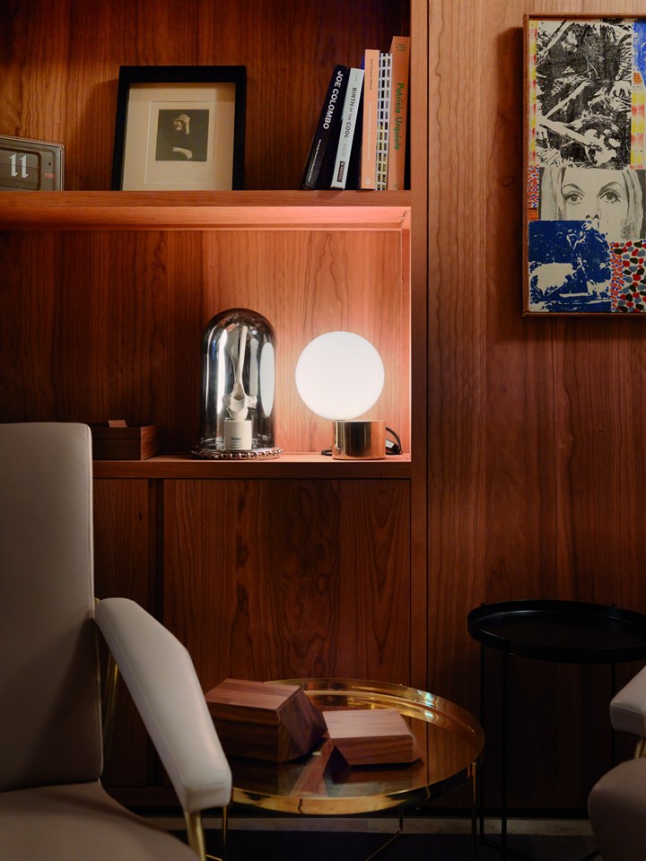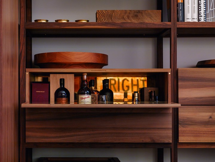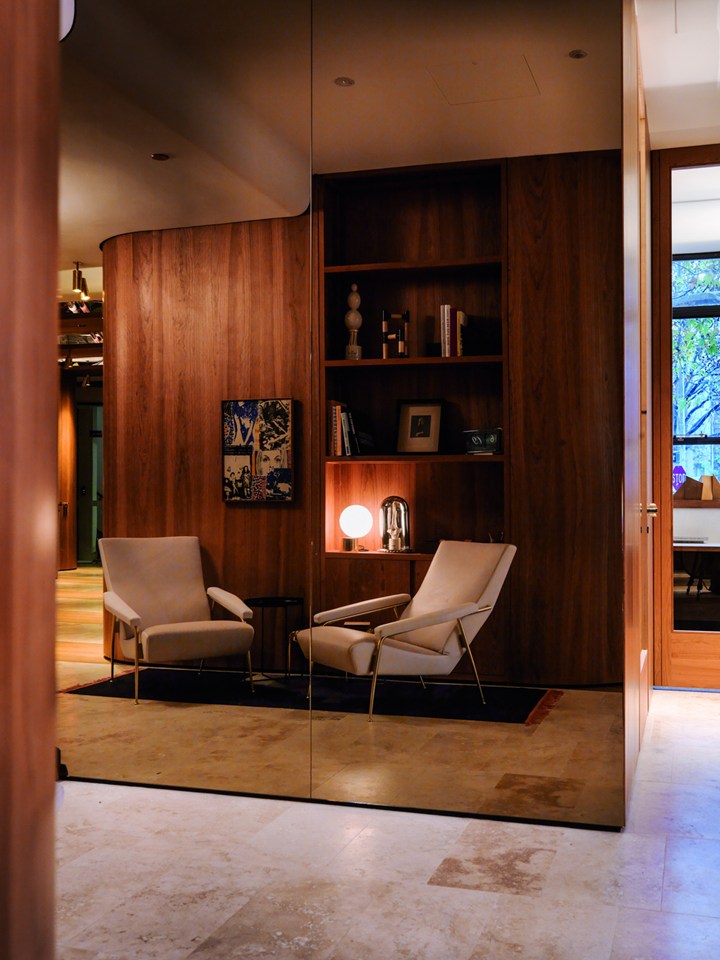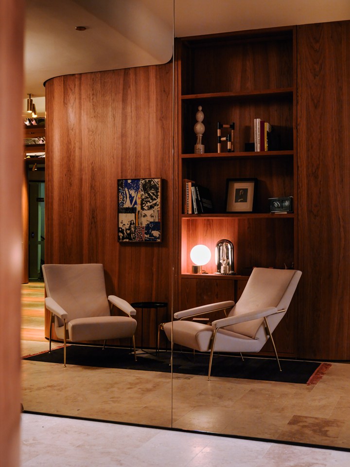 Проект включает использование американской вишни и латуни, что придает интерьеру роскошный и стильный вид. Дизайн вдохновлён эстетикой 1950-х годов.