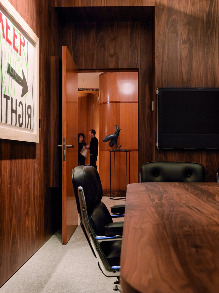 Офисные помещения оформлены с акцентом на натуральные материалы, такие как кожа и мрамор, что создает уникальную атмосферу.
