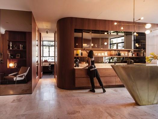 Проект включает использование американской вишни и латуни, что придает интерьеру роскошный и стильный вид. Дизайн вдохновлён эстетикой 1950-х годов.