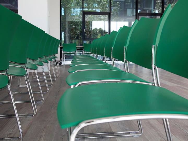 Стулья обладают прочной рамой и корпусом из 100% переработанного пластика. Они устойчивы к механическим повреждениям и доступны в различных цветах.