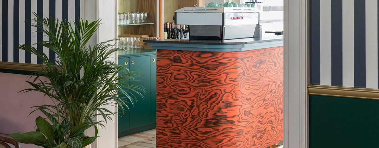 В магазине Luddites Books & Wine архитекторы использовали шпон ALPI для облицовки вертикальных поверхностей, включая барную стойку. Это решение позволило создать уникальную атмосферу, соединив элементы ар-деко с современными тенденциями.