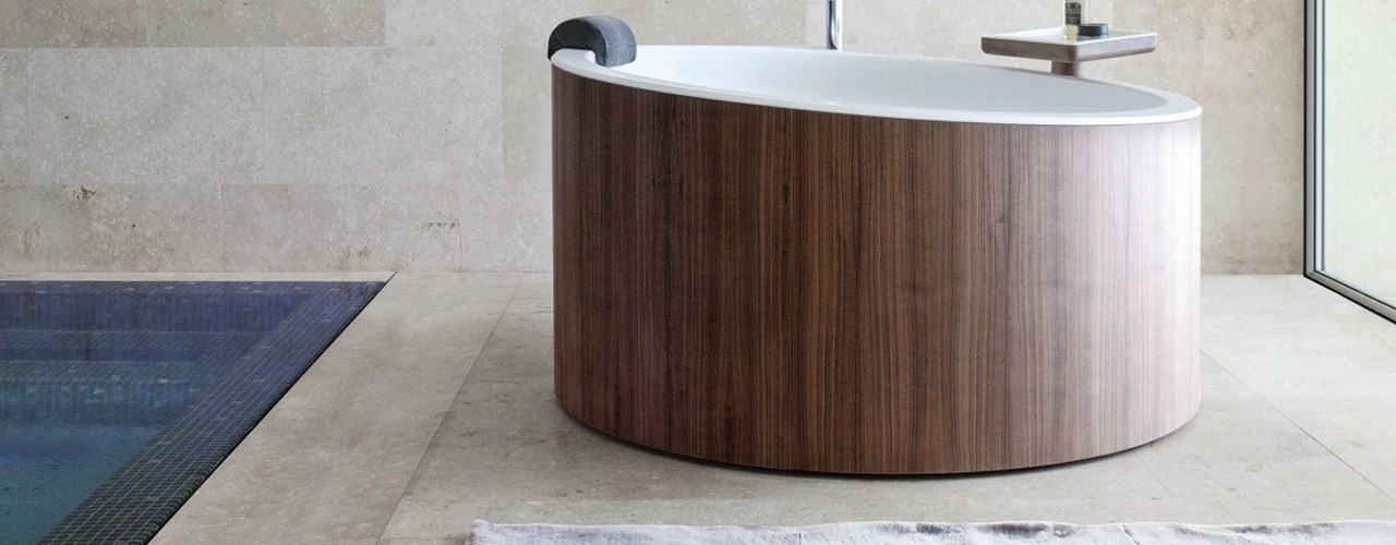 Коллекция включает раковину, полку с крючком для полотенец и комод с подвижным зеркалом. Ванна изготовлена из термоформованной панели Corian® DuPont™ и массива древесины, что придает ей уникальную геометрию и привлекательность.