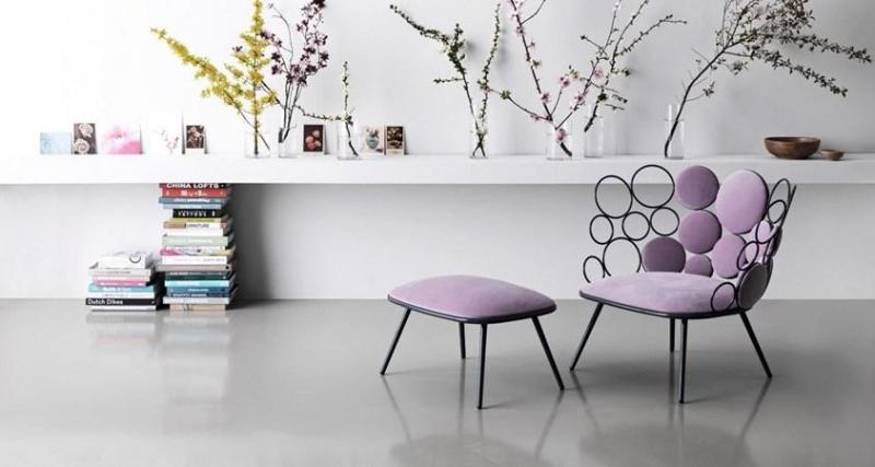 Коллекция включает кресла, диваны, столики и пуфики, которые отличаются легкостью и декоративностью. Металлические кольца и подушки создают гармоничные композиции, придавая мебели воздушность.