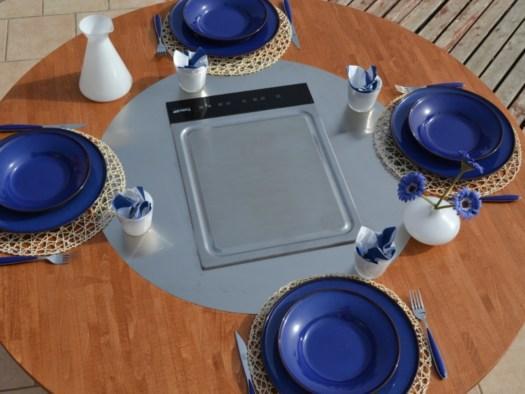 Стол выполнен из ламеллярного бука с отделкой под орех и стальной варочной поверхностью.