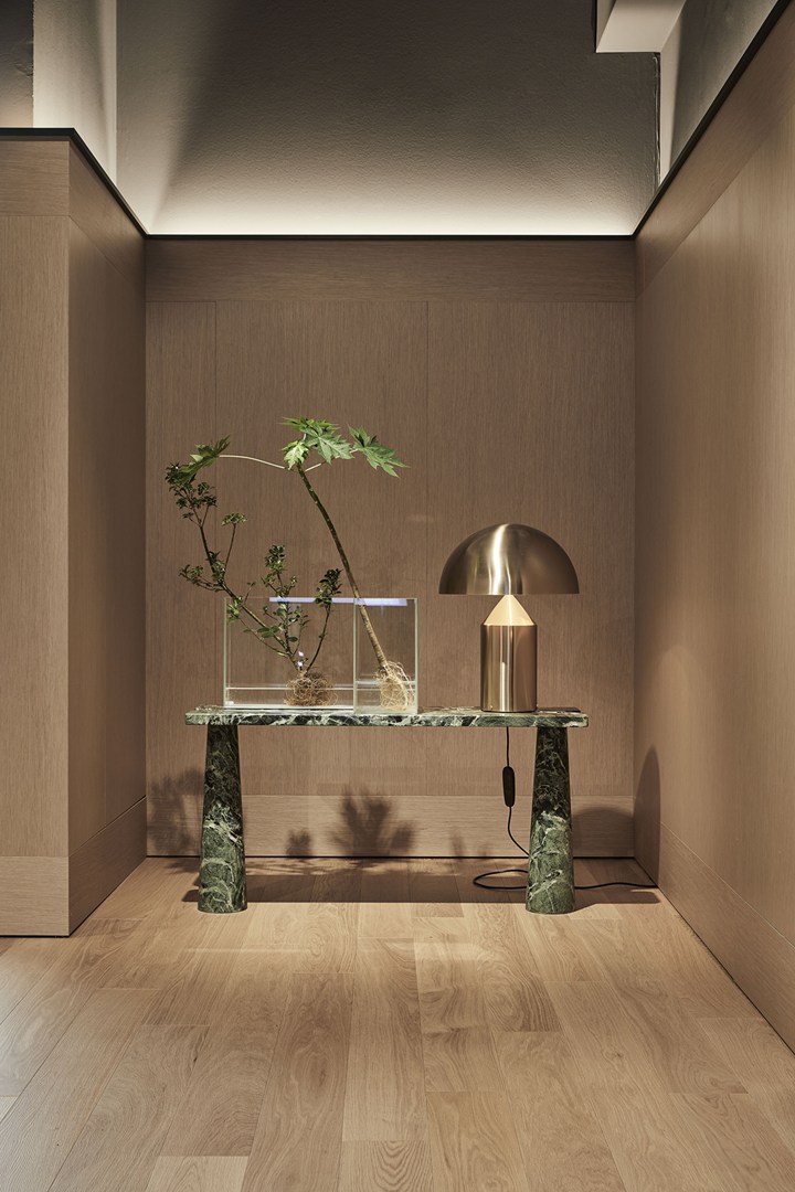 Черная и золотая версии лампы Atollo были использованы в концептуальном магазине и зоне Spa-Wellness, подчеркивая их уникальный стиль.