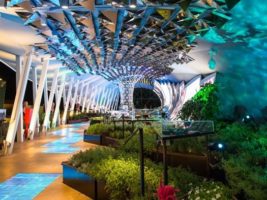 Световые решения включают в себя использование даунлайтов Portik и садовых проекторов Pixar, которые усиливают архитектурные особенности павильона.