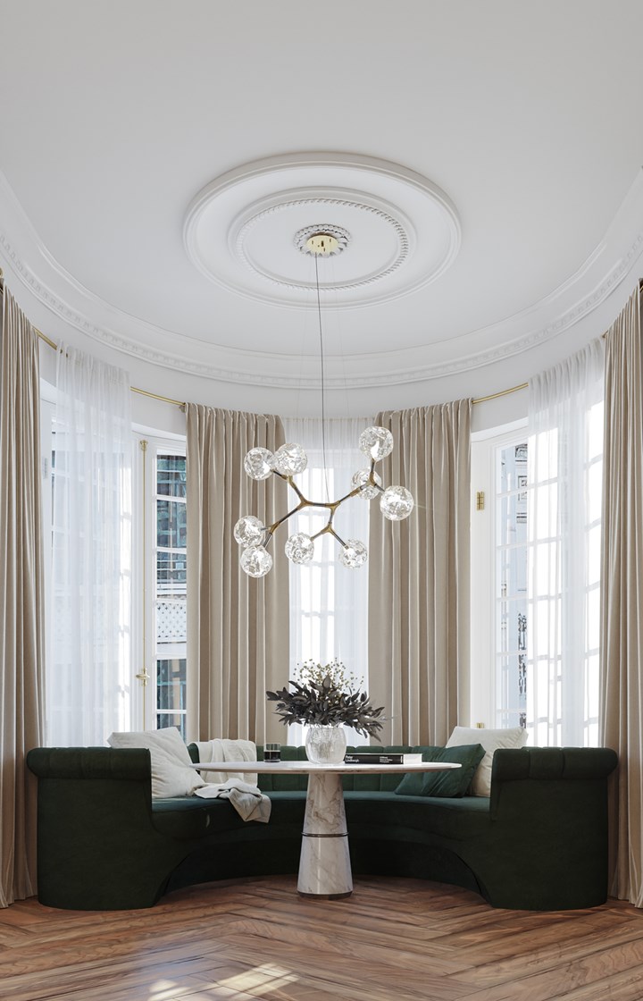 В квартире Éternel используются мрамор, латунь и бархат, которые придают интерьеру элегантность и уют.