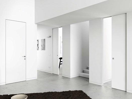 Коллекция предлагает модульные системы для создания полностью гладких стен. Узнайте, как интегрировать дизайнерские решения в ваш интерьер, используя раздвижные и распашные двери без видимых рамок.