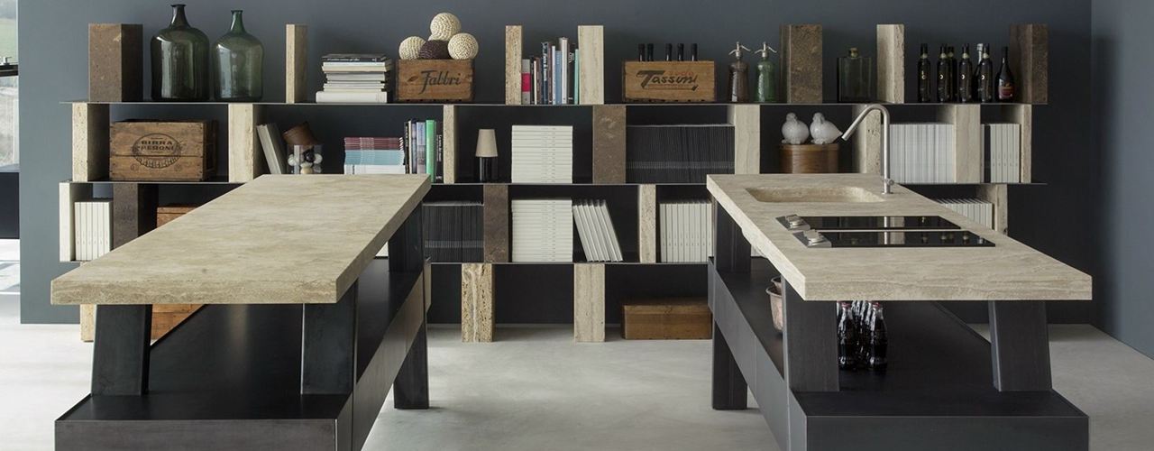 Компания Vaselli предлагает инновационные решения, такие как модульная кухонная система CAEDO с каменными столешницами и бетонными дверями, а также отдельностоящая стойка SIDER из листового железа и мрамора.