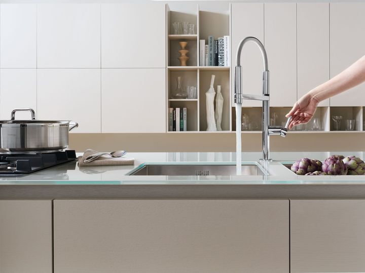 Модели от Nobili имеют поворотный излив и ручной душ, что обеспечивает удобство использования и добавляет кухне современный вид.