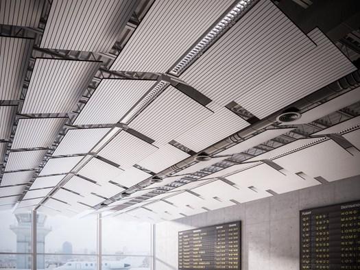 Панели Паспарту подвешиваются на тросах, что облегчает доступ к системам. Они обеспечивают эффективное звукопоглощение и могут быть адаптированы под любые формы и размеры помещений.