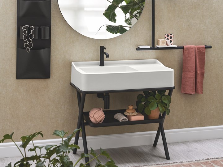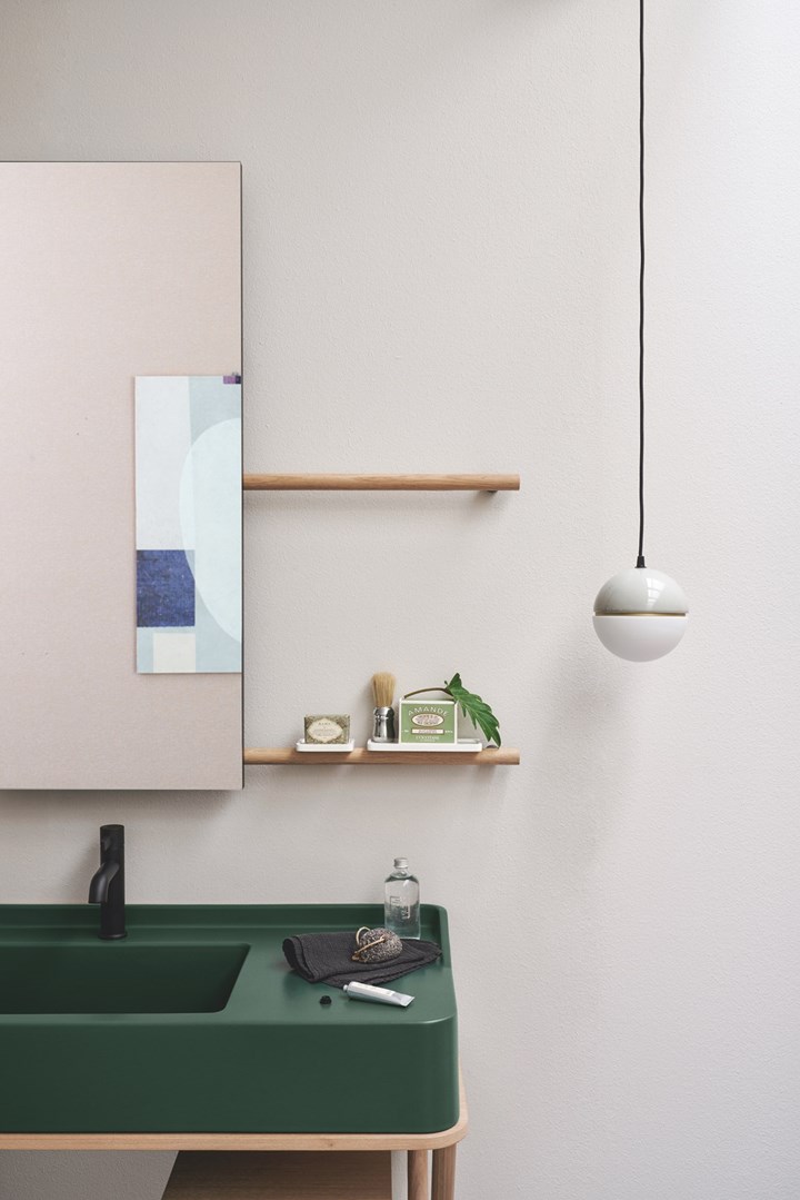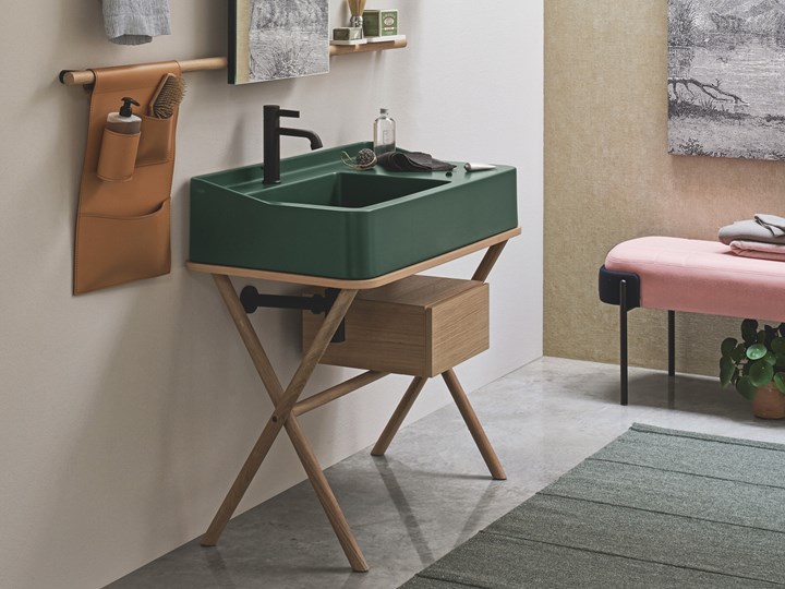 Раковины доступны в 16 оттенках, что позволяет легко подобрать их под любой интерьер. Аксессуары из массива дерева и металла добавляют изысканности.