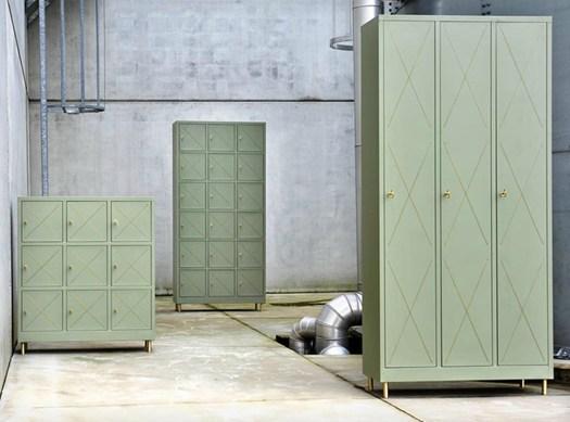 Коллекция включает комоды, шкафы и консоли, выполненные в пастельных оттенках и дополненные световыми линиями. Латунная нить добавляет элемент сюрреализма и функциональности.