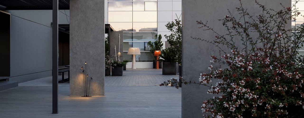 Vibia предлагает уникальные решения, объединяя минимализм и природные материалы. Хосеп Луис Ксукла спроектировал террасы, которые сочетают в себе дерево, глину и железо, создавая комфортные зоны для общения и демонстрации освещения.