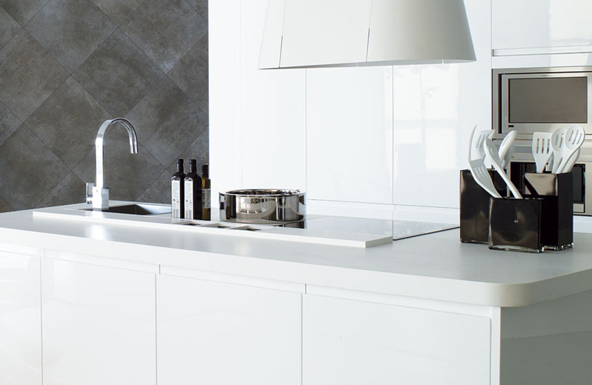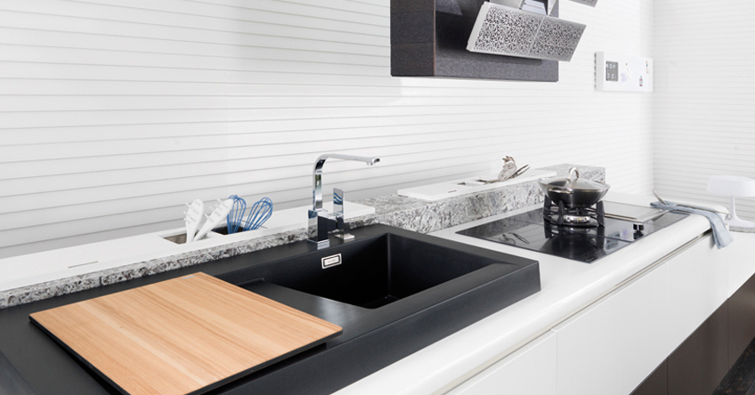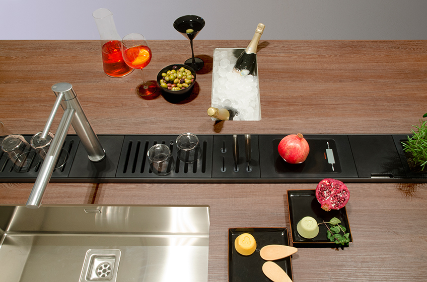 Встраиваемый кухонный канал из окрашенного алюминия серого цвета с дренажом.