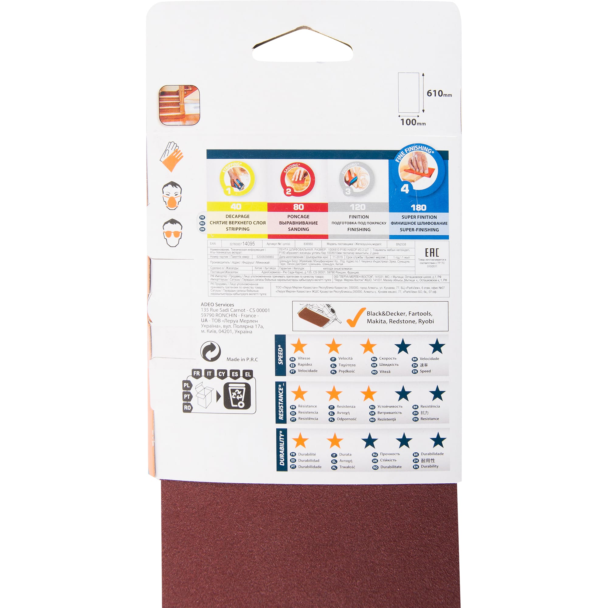 Лента шлифовальная Dexter служит для обработки дерева, металла, пластика. Замкнутая в кольцо шкурка имеет зернистость P180 (применяется для финальной зачистки поверхности от краски, для придания поверхности гладкости, для шлифовки под покраску; может использоваться с мягкими породами дерева). Лента устанавливается на электрический напильник. Изделие размером 100 × 610 мм поставляется в наборе из 2 штук. Произведено в Китае и имеет гарантию 1 год.