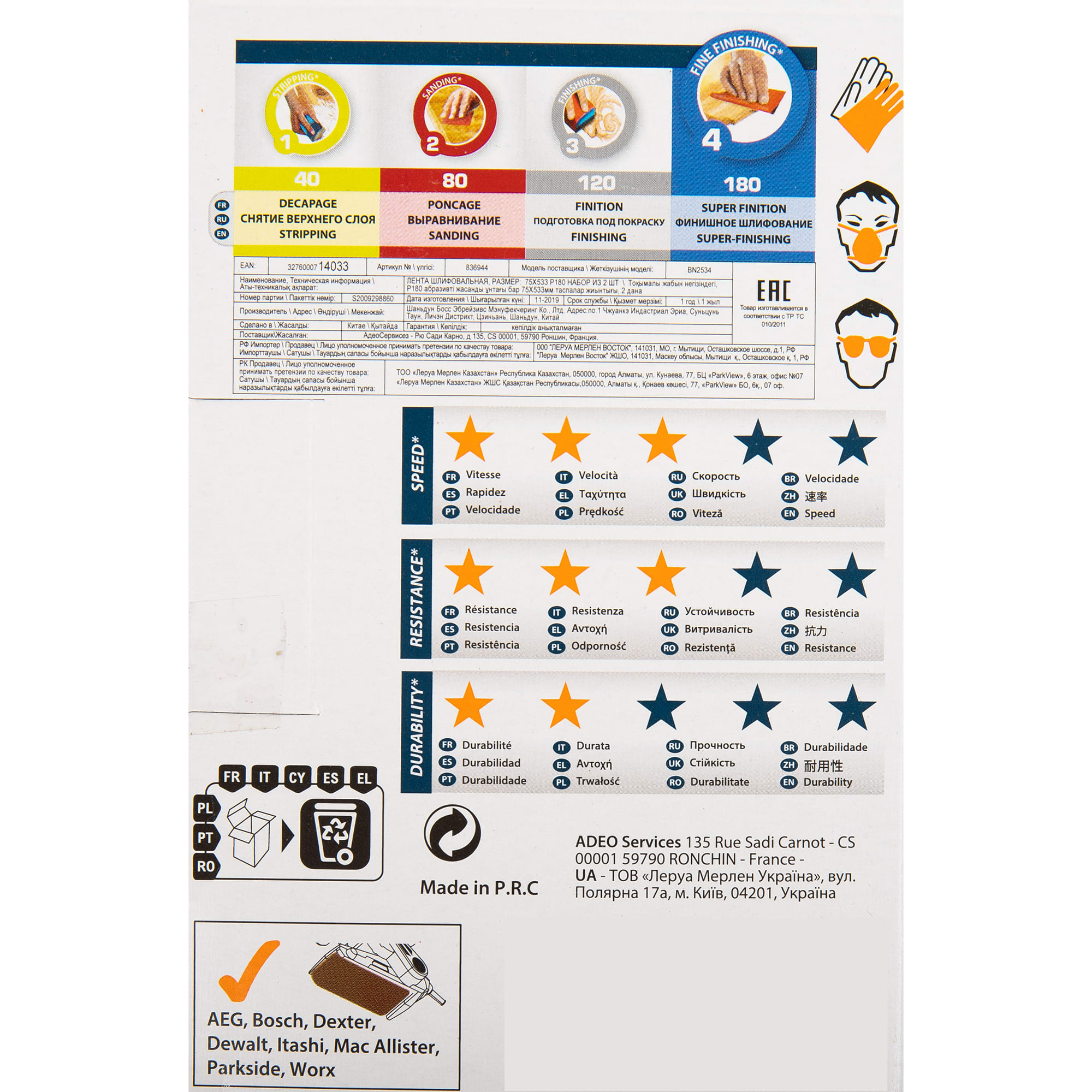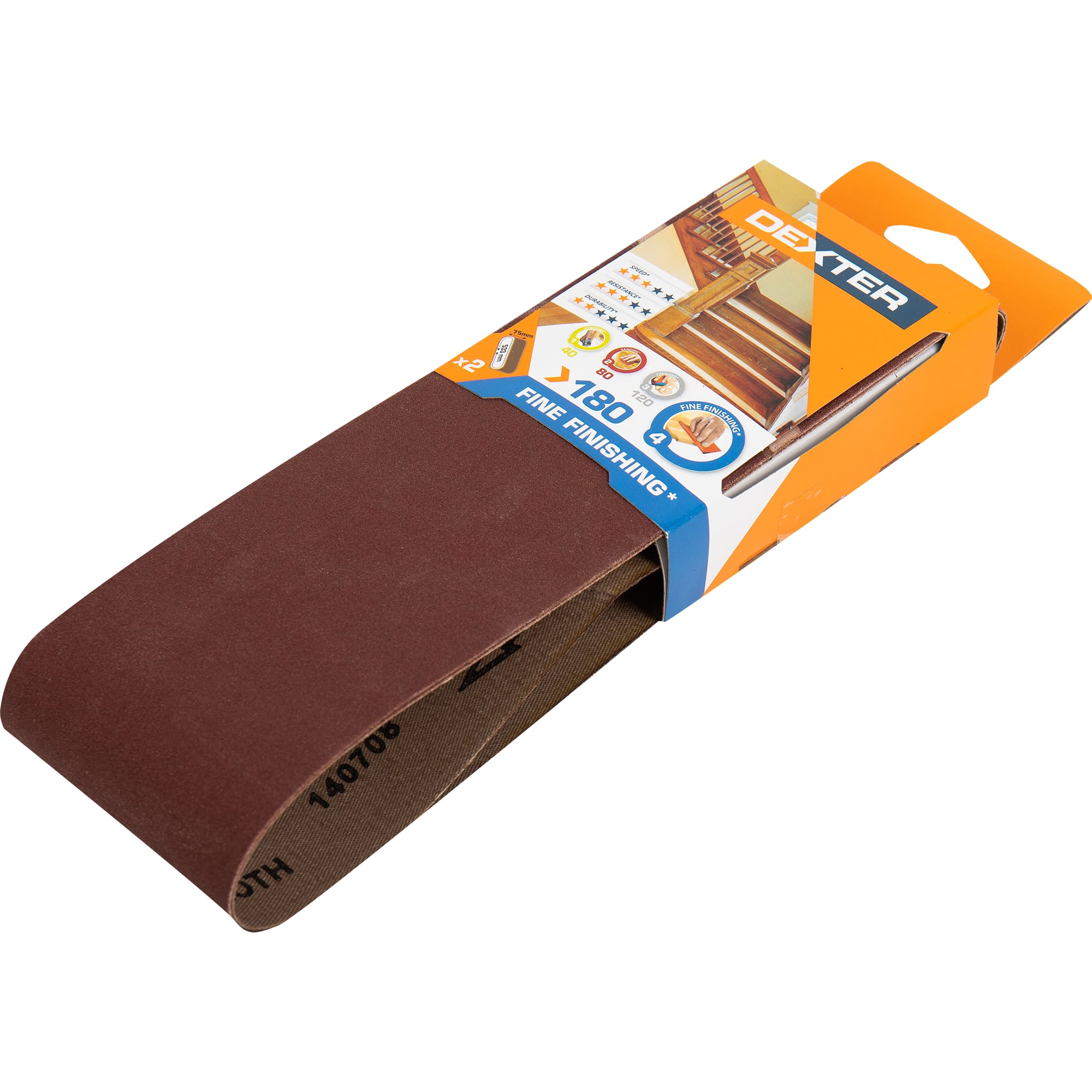 Лента шлифовальная Dexter служит для обработки дерева, металла, пластика. Замкнутая в кольцо шкурка имеет зернистость P180 (применяется для финальной зачистки поверхности от краски, для придания поверхности гладкости, для шлифовки под покраску; может использоваться с мягкими породами дерева). Лента устанавливается на электрический напильник. Изделие размером 75 × 533 мм поставляется в наборе из 2 штук. Произведено в Китае и имеет гарантию 1 год.