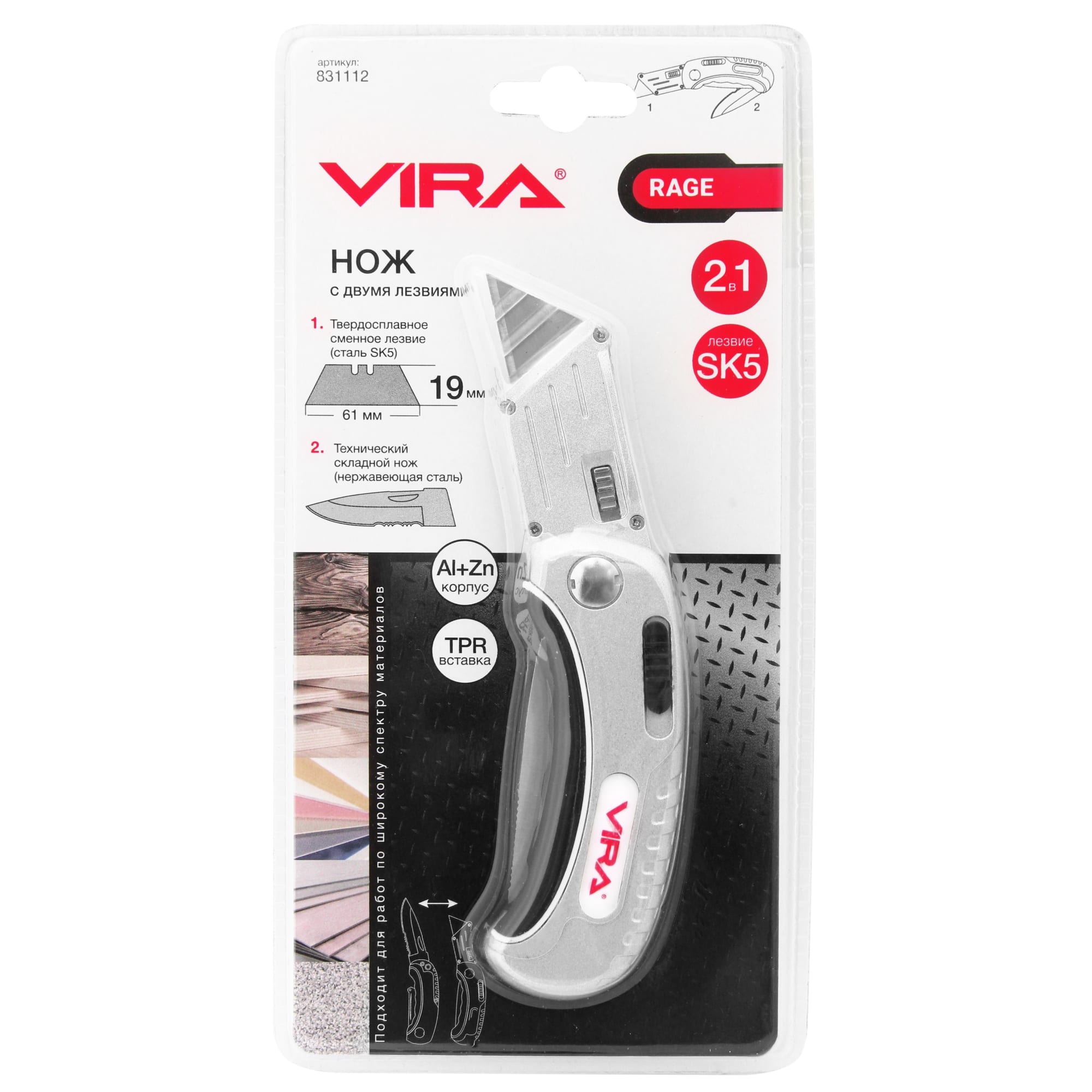 Универсальный складной нож VIRA сочетает в себе надежность металлического корпуса и функциональность двух типов лезвий для различных задач.