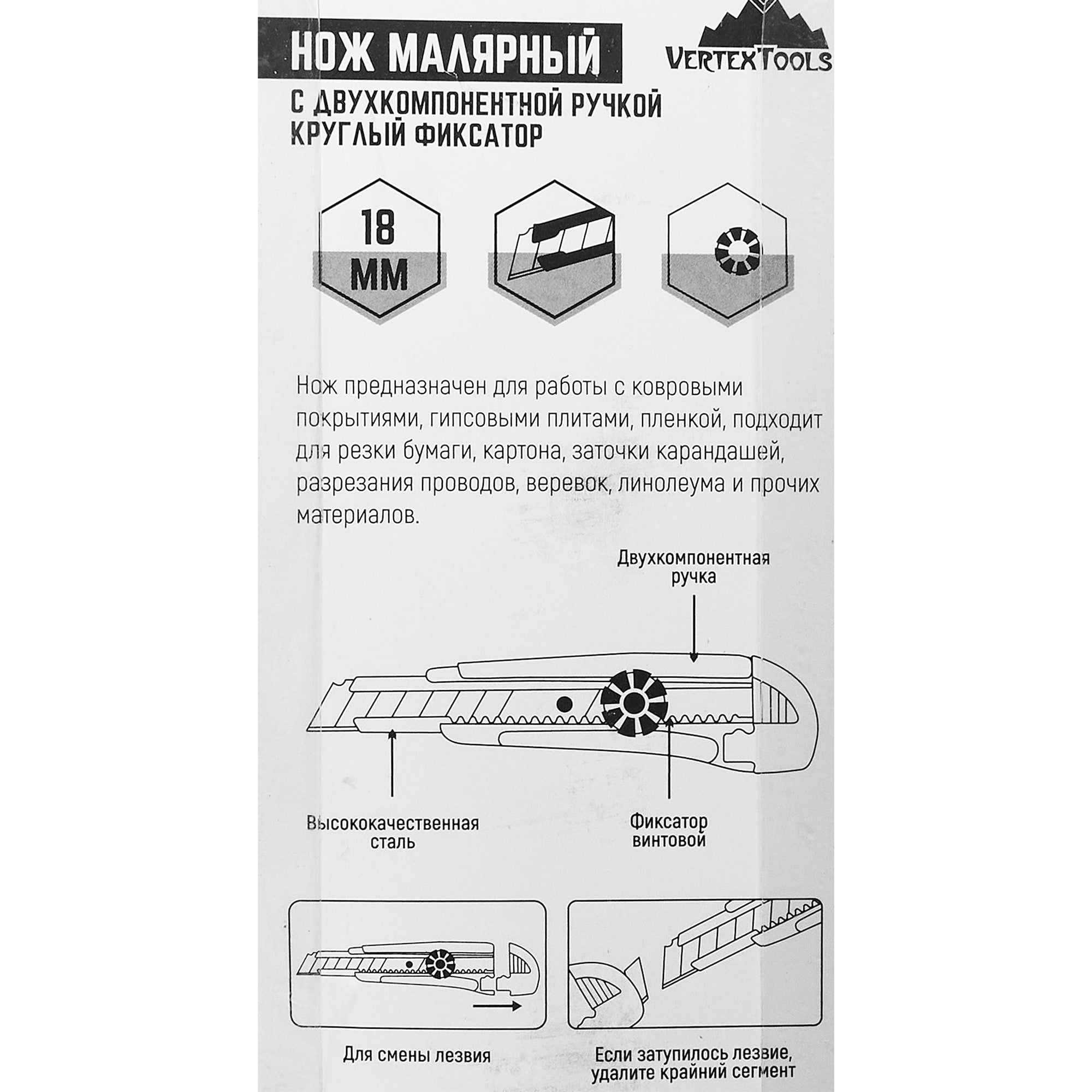 Строительный нож Vertextools с противоскользящей рукояткой и сегментным лезвием 18 мм 84657015 STLM-0053272