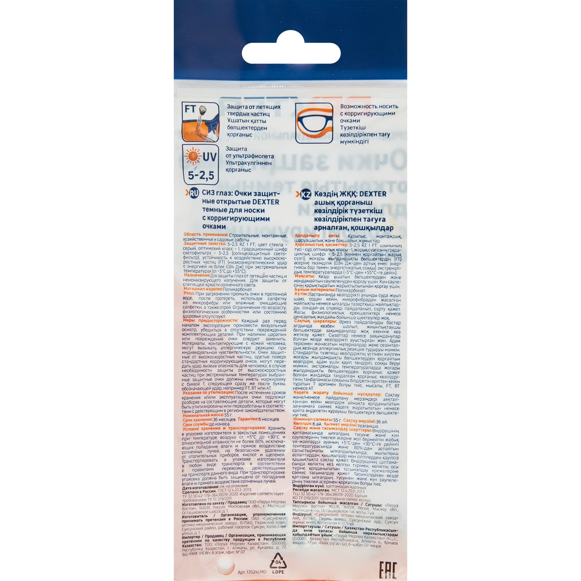 | Модель продукта | Очки защ. откр. DEXTERтемны для нос.корр |