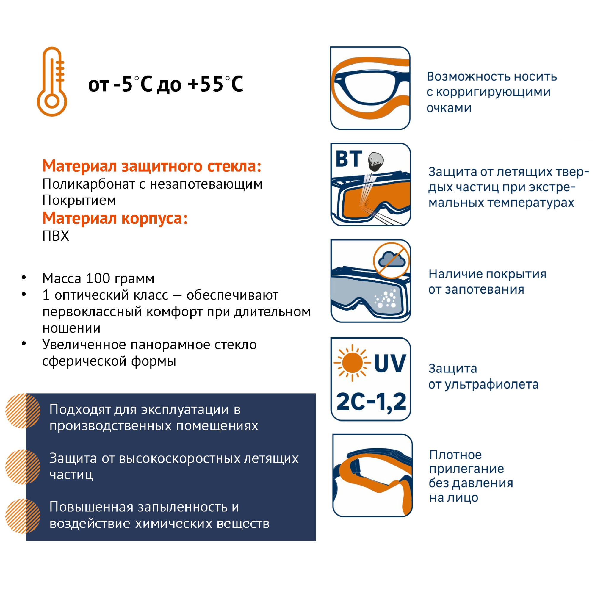Для поддержания прозрачности линз рекомендуется регулярная очистка специальными средствами. Очки совместимы с большинством средств индивидуальной защиты.