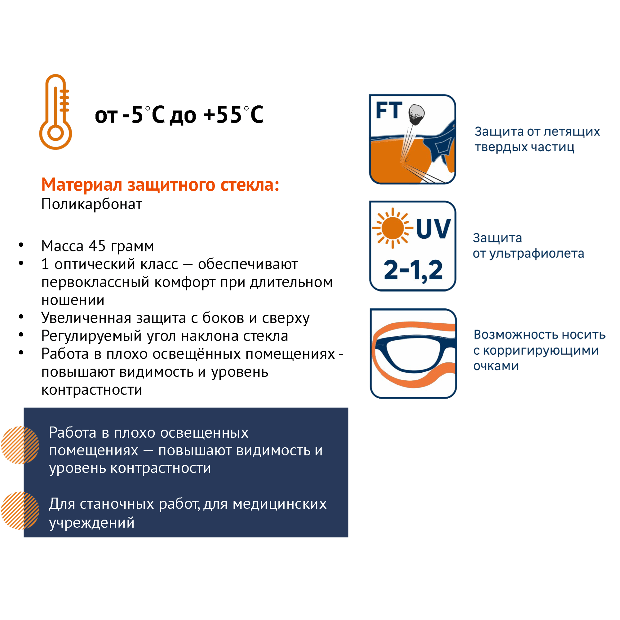 Профессиональные защитные очки обеспечивают полную защиту зрительных органов во время различных рабочих процессов. Легкая конструкция весом всего 43 грамма создает комфорт при длительном использовании.