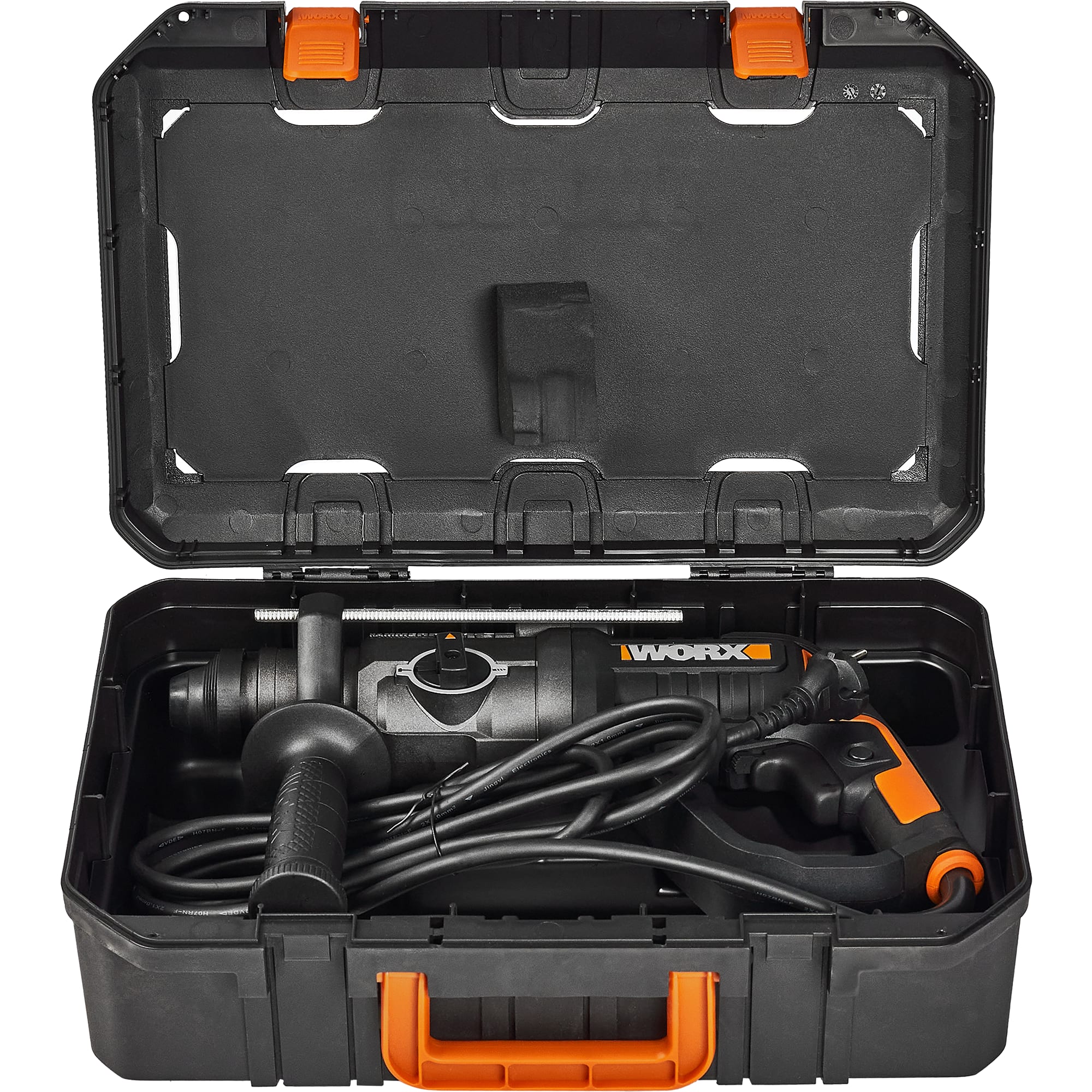 | Аксессуары в комплекте | Комплектация, Перфоратор WORX WT343, Дополнительная ручка Ограничитель глубины сверления 3 SDS сверла 1 SDS плоское зубило Пластиковый бокс |