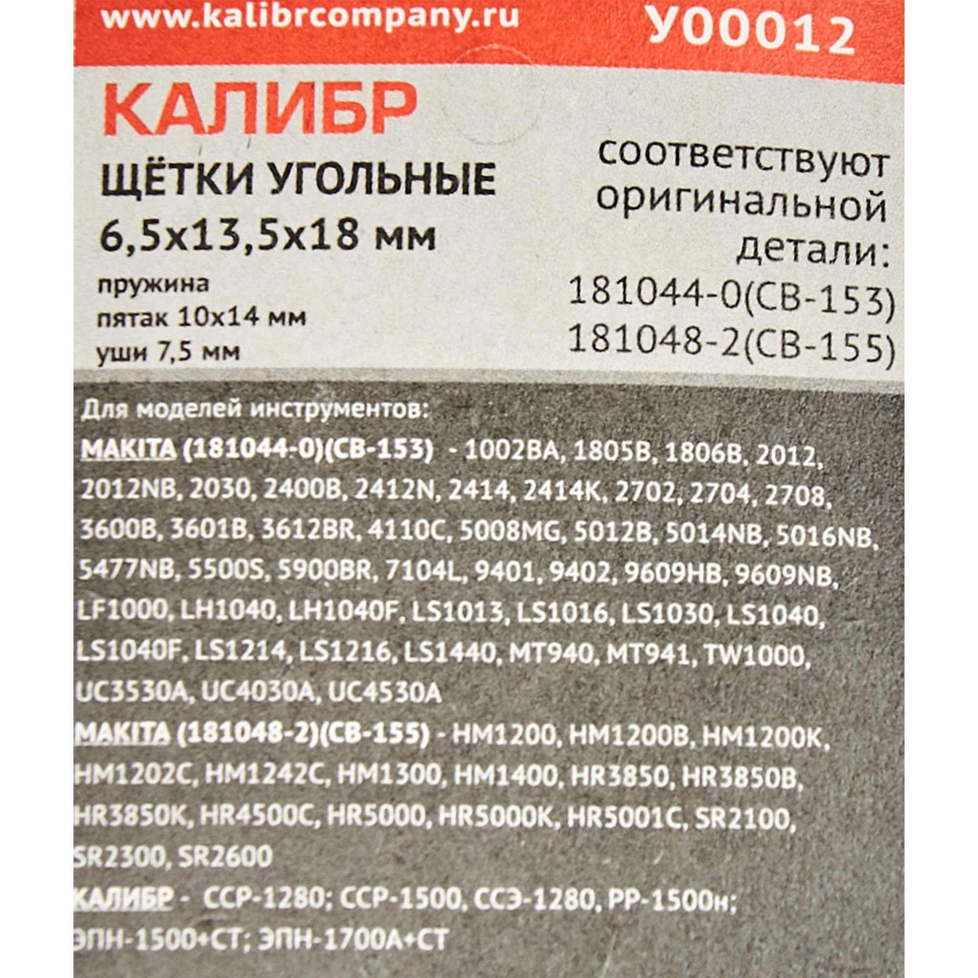 Щетки угольные Калибр У00012 — сменный элемент для двигателей электрических дрелей MAKITA. Соответствуют оригинальной детали 191963-2 CB-303. Полный перечень совместимых инструментов представлен на упаковке.