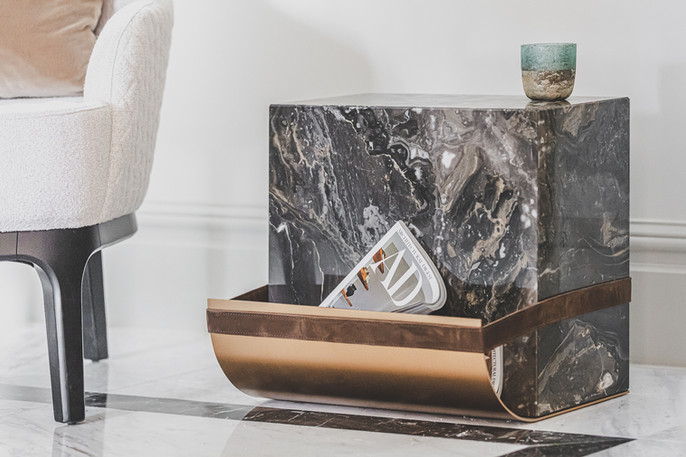 Амброджио-ваша рука помощи; всегда готов подержать ваш напиток или присмотреть за вашими журналами. Амброджио сделан из мрамора, который лежит поверх изогнутого металлического листа, который, по-видимому, удерживается кожаным ремешком. Все элементы Амброджио могут быть изготовлены по индивидуальному заказу, начиная с камня, кожи/ткани и металла. Металлическая Отделка - Сатин (Бронза, Латунь, Шампанское, Алюминий) - Полированный (Бронза, Латунь, Шампанское, Алюминий) - Любой Цвет RAL Стандартная мраморная отделка - Carrara CD - Arabescato Orobico - Dark Emperador - Nero Marquina - Travertino Премиальная мраморная отделка - Verde Alpi - Calacatta Oro - Rosso Levanto - Botanic Green - Rosa Egeo Обивка - Кожа Алюминиевая конструкция, покрытая мраморными панелями толщиной 2 см. Гнутая сталь, обработанная вручную и ввинченная в конструкцию. Отделан кожаным ремешком, который фиксируется на месте. Поставляется с войлочными накладками. Размер приставного столика 44 x 37 x 40 см
