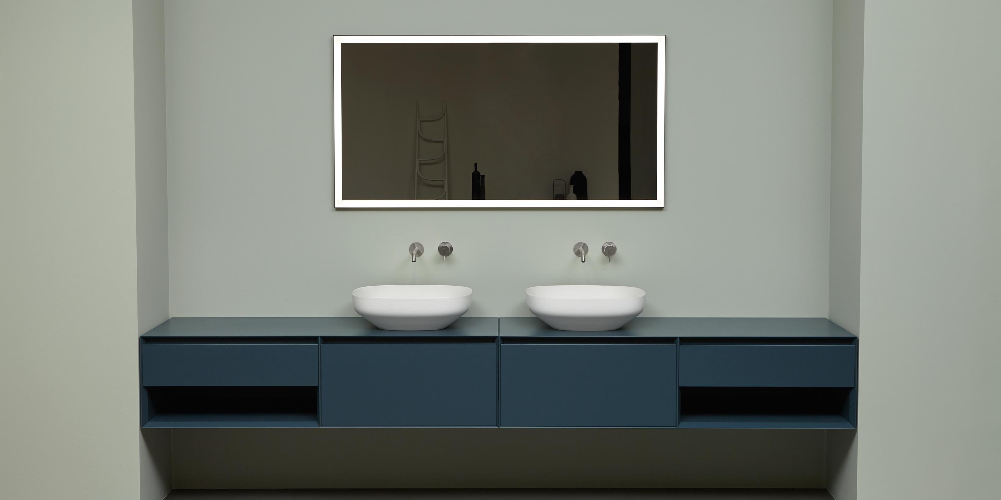 Он напоминает картину благодаря пескоструйной раме шириной 3 см по периметру, оснащенной светодиодной подсветкой. Vertice - это зеркало толщиной 4 мм, поддерживаемое черной алюминиевой структурой и драгоценной яркой рамой, отражающее повседневную жизнь в ванной.