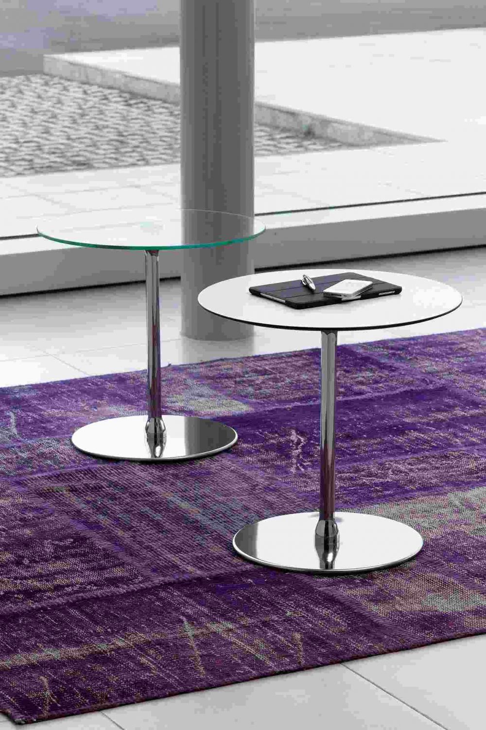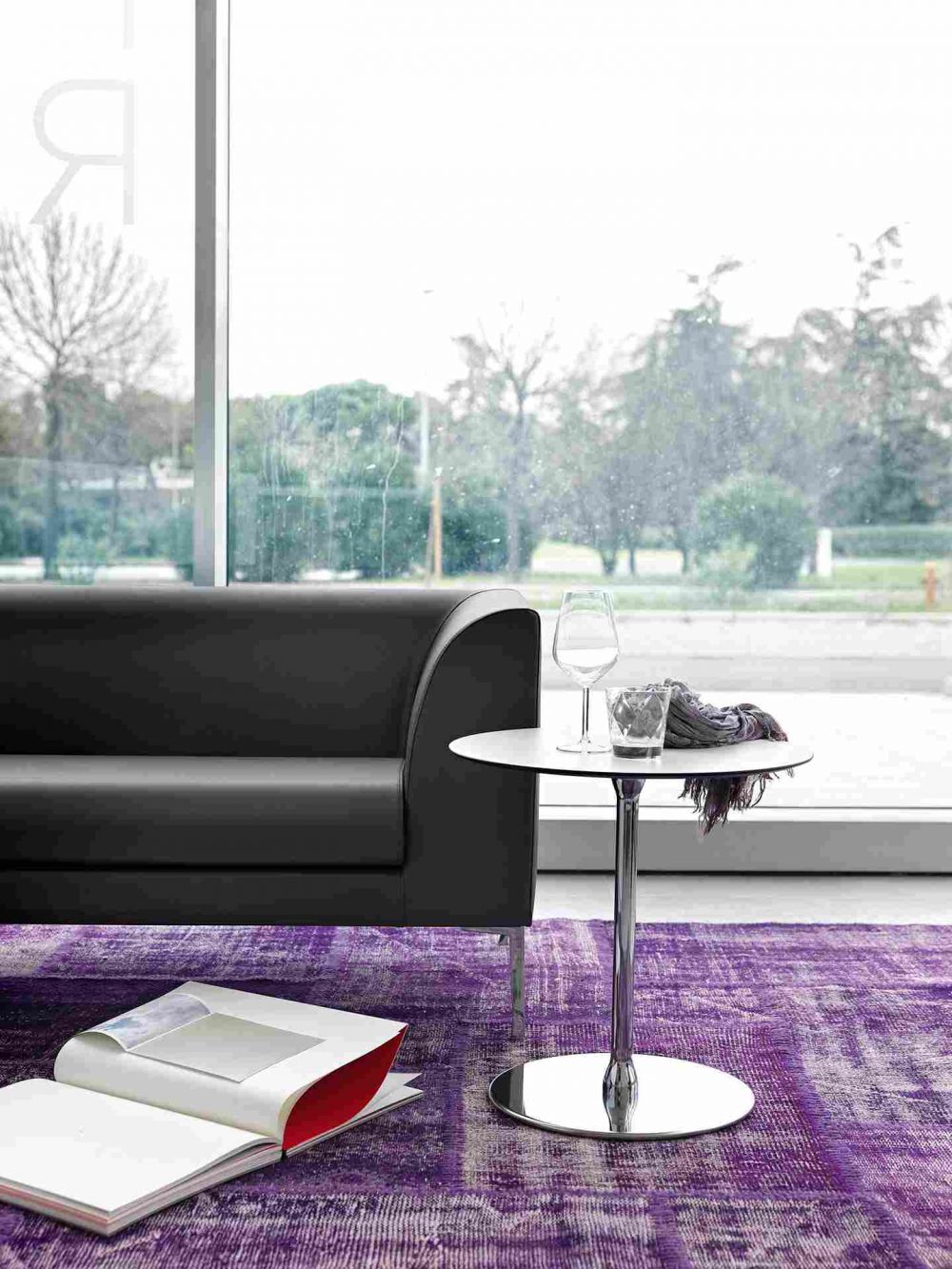 Классический металлический журнальный столик мягкой формы со столешницей из стекла или HPL.